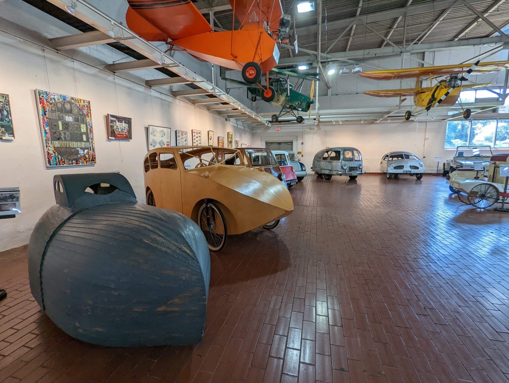 One of the distinctive cars was a replica of the 1933 Dymaxion designed by Buckminster Fuller. Built as an experimental prototype, it had sheet aluminum attached to an ash frame with a V8 engine, rear-steering, and front-wheel drive.