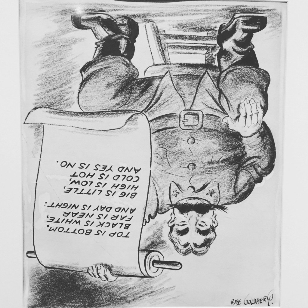 Concerning Russia, men in high positions have warned, “You cannot negotiate with them (Russians).” Mr. Churchill said of Russia, “A riddle wrapped in a mystery inside an enigma.” Rube Goldberg, who drew one of those crazy cartoons years ago, called Joe Stalin “The Great Upside-down Philosopher.” That cartoon had a message: “Top is bottom, black is white, far is near, and the day is night. Big is little, high is low, cold is hot, and yes is no.” Sounds unreasonable or insane? This is the basic philosophy of Russia even today.